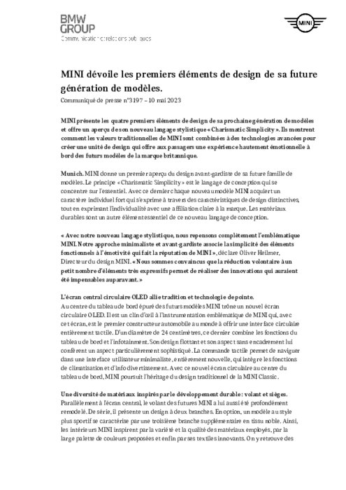 MINI donne un premier aperçu du design avant-gardiste de sa future famille de modèles. Le principe « Charismatic Simplicity » est le langage de conception qui se concentre sur l'essentiel. Avec ce dernier chaque nouveau modèle MINI acquiert un caractère individuel fort qui s'exprime à travers des caractéristiques de design distinctives, tout en exprimant l'individualité avec une affiliation claire à la marque.
