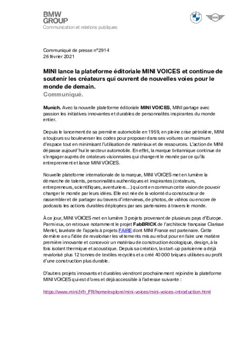 Avec la nouvelle plateforme éditoriale MINI VOICES, MINI partage avec passion les initiatives innovantes et durables de personnalités inspirantes du monde entier. Depuis le lancement de sa première automobile en 1959, en pleine crise pétrolière, MINI a toujours su bouleverser les codes pour proposer dans ses voitures un maximum d’espace tout en minimisant l’utilisation de matériaux et de ressources. L’action de MINI dépasse aujourd’hui le secteur automobile...