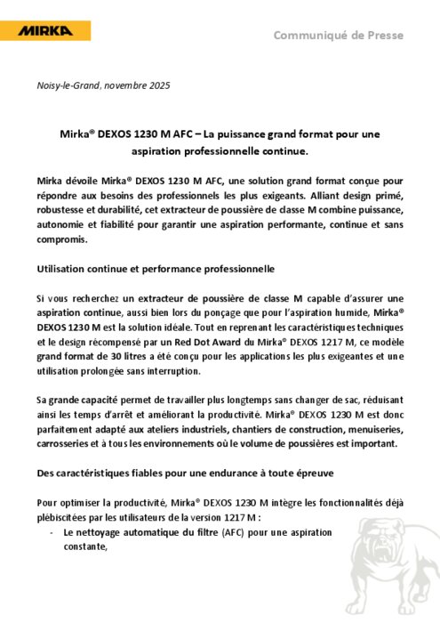 Mirka dévoile Mirka Dexos 1230 M AFC, une solution grand format conçue pour répondre aux besoins des professionnels les plus exigeants. Alliant design primé, robustesse et durabilité, cet extracteur de poussière de classe M combine puissance, autonomie et fiabilité pour garantir une aspiration performante, continue et sans compromis.