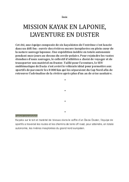 Cet été, une équipe composée de six kayakistes de l’extrême s'est lancée dans un défi fou : ouvrir des rivières encore inexplorées en plein cœur de la nature sauvage laponne. Une expédition inédite en totale autonomie pendant onze jours au-dessus du cercle-polaire. Pour rejoindre les vastes étendues d’eaux sauvages, le collectif d’athlètes a choisi de voyager et de transporter son matériel en Duster.