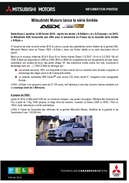 Après les séries "S-Edition" et "S-Concept" en 2015, le Mitsubishi ASX renouvelle son offre avec le lancement en France de la nouvelle série limité "S-Style".