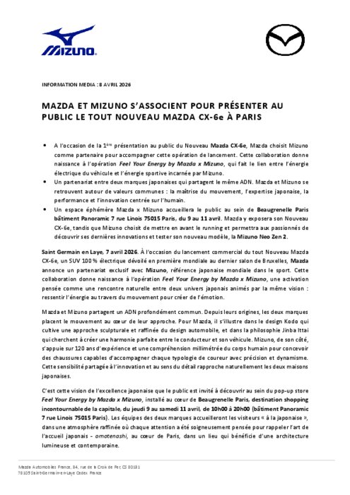 À l’occasion du lancement commercial du tout Nouveau Mazda CX-6e, un SUV 100 % électrique dévoilé en première mondiale au dernier salon de Bruxelles, Mazda annonce un partenariat exclusif avec Mizuno, référence japonaise mondiale dans le sport. Cette collaboration donne naissance à l’opération Feel Your Energy by Mazda x Mizuno, une activation pensée comme une rencontre naturelle entre deux univers japonais animés par la même vision : ressentir l’énergie au travers du mouvement pour créer de l’émotion.