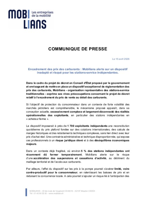 Dans le cadre du projet de décret en Conseil d'État proposé par le gouvernement et envisageant de mettre en place un dispositif exceptionnel de réglementation des prix des carburants, Mobilians - organisation représentative des stations-service traditionnelles - exprime ses vives préoccupations concernant le projet de décret relatif à l’encadrement du prix de vente au détail des carburants.