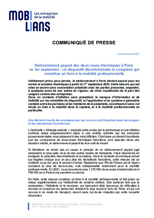 Initialement prévu pour janvier, le stationnement à Paris devient payant pour les motos et scooters thermiques à partir du 1er septembre 2022. Cette mesure, qui est mise en œuvre sans concertation préalable avec les parties prenantes, engendre, à quelques jours de son entrée en vigueur, de vives inquiétudes de la part des usagers comme des entreprises.