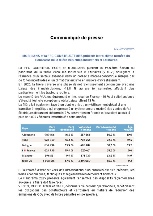 La FFC CONSTRUCTEURS et Mobilians publient la troisième édition du panorama de la filière Véhicules Industriels et Utilitaires (VUL-VI) soulignant la résilience d’un secteur essentiel dans un contexte macro-économique marqué par de fortes incertitudes et un climat d’attentisme en matière d’investissement. En 2025, la filière traverse une phase de net ralentissement économique avec une baisse des immatriculations, -18,8 % au premier semestre, affectant plus particulièrement les tracteurs routiers.