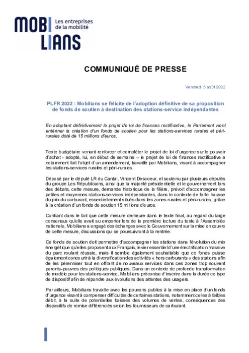 Texte budgétaire venant renforcer et compléter le projet de loi d’urgence sur le pouvoir d’achat - adopté, lui, en début de semaine –, le projet de loi de finances rectificative a notamment fait l’objet d’un amendement, travaillé par Mobilians, visant à accompagner les stations-services rurales et péri-rurales.