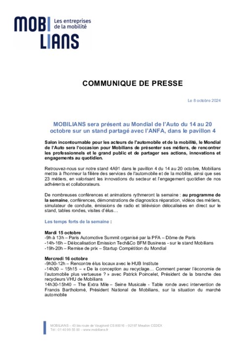 Salon incontournable pour les acteurs de l'automobile et de la mobilité, le Mondial de l’Auto sera l’occasion pour Mobilians de présenter ses métiers, de rencontrer les professionnels et le grand public et de partager ses actions, innovations et engagements au quotidien.