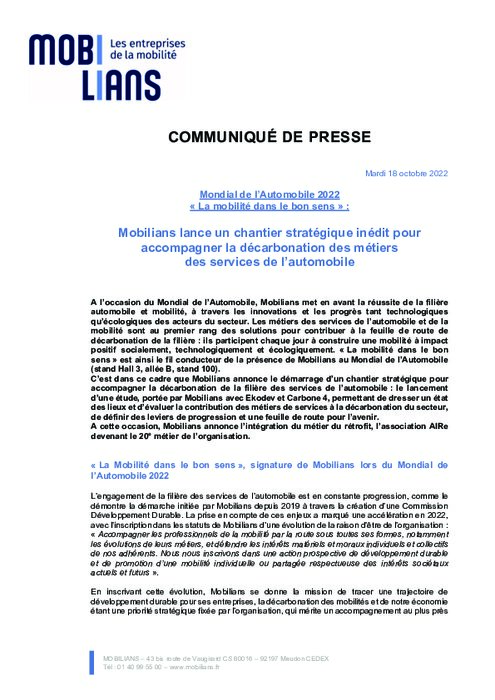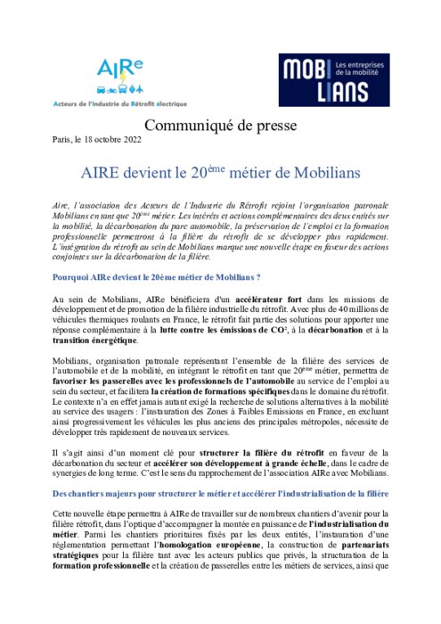 Un chantier stratégique inédit pour accompagner la décarbonation des métiers des services de l’automobile ; Aire, l’association des Acteurs de l’Industrie du Rétrofit rejoint l’organisation patronale en tant que 20ème métier ; BCA Expertise et Mobilians - Branche Recycleurs signent une charte formalisant leurs accords professionnels.