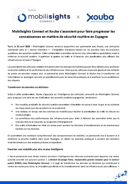 Mobilisights Connect annonce son partenariat avec Xouba, une entreprise spécialisée dans le « dernier kilomètre » : l’intégration d’analyses basées sur les données dans les processus quotidiens des autorités routières. Cette collaboration permettra de fournir des informations exploitables visant à renforcer la sécurité routière, à optimiser la gestion du trafic et à favoriser une planification plus efficace des infrastructures à travers l’Espagne.