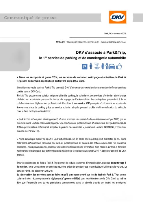 Dans les aéroports et gares TGV, les services de voiturier, nettoyage et entretien de Park & Trip sont désormais accessibles au travers de la DKV Card. Son alliance avec la start-up Park & Trip permet à DKV d'annoncer un nouvel enrichissement de l'offre de services portée par sa DKV Card. Park & Trip propose une solution originale alliant le parking, le voiturier et des services d'entretien et de lavage réalisés sur le véhicule pendant le temps du voyage de l'automobiliste.