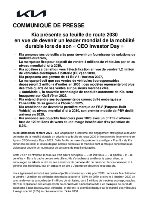 Kia Corporation a confirmé son engagement stratégique à devenir un leader de la mobilité durable en dévoilant sa feuille de route 2030 à l’occasion de l’événement en ligne « CEO Investor Day » 2022. Cette feuille de route s’appuie sur la stratégie « Plan S » de Kia annoncée en 2020, et révèle de plus amples détails sur la manière dont la marque concrétisera sa vision pour devenir un fournisseur de solutions de mobilité durables.