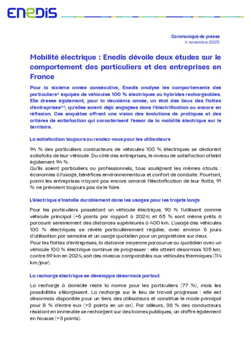 Pour la sixième année consécutive, Enedis analyse les comportements des particuliers équipés de véhicules 100 % électriques ou hybrides rechargeables. Elle dresse également, pour la deuxième année, un état des lieux des flottes d’entreprises, qu’elles soient déjà engagées dans l’électrification ou encore en réflexion. Ces enquêtes offrent une vision des évolutions de pratiques et des critères de satisfaction qui caractérisent l’essor de la mobilité électrique sur le territoire.