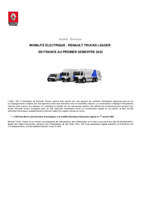 L’offre 100 % électrique de Renault Trucks repose tout autant sur une gamme de camions électriques éprouvée, que sur un accompagnement complet des transporteurs dans leur transition vers la neutralité carbone. Le constructeur a déployé d’importants moyens pour former ses équipes et a labellisé la totalité de ses réparateurs agréés. Des efforts qui s’avèrent payant, puisqu’à miannée, Renault Trucks enregistre plus de 350 véhicules électriques livrés ou commandés depuis le 1er janvier 2022.