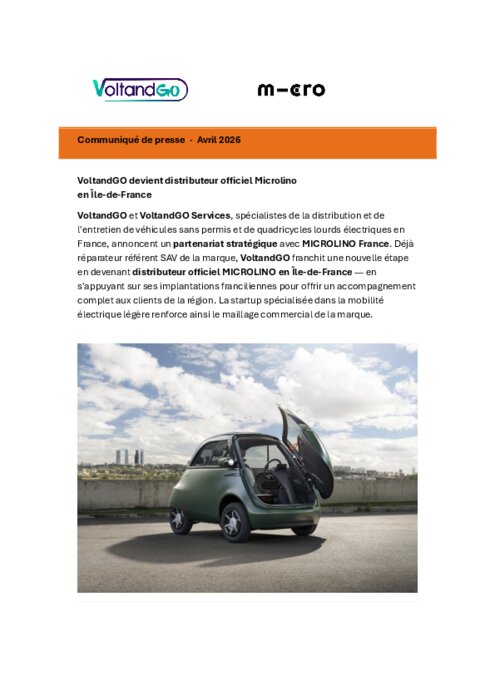 VoltandGO et VoltandGO Services, spécialistes de la distribution et de l'entretien de véhicules sans permis et de quadricycles lourds électriques en France, annoncent un partenariat stratégique avec MICROLINO France. Déjà réparateur référent SAV de la marque, VoltandGO franchit une nouvelle étape en devenant distributeur officiel MICROLINO en Île-de-France. La startup spécialisée dans la mobilité électrique légère renforce ainsi le maillage commercial de la marque.