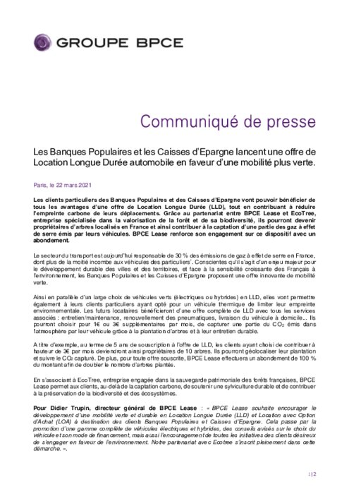 Les clients particuliers des Banques Populaires et des Caisses d’Epargne vont pouvoir bénéficier de tous les avantages d’une offre de Location Longue Durée, tout en contribuant à réduire l’empreinte carbone de leurs déplacements. Grâce au partenariat entre BPCE Lease et EcoTree, entreprise spécialisée dans la valorisation de la forêt et de sa biodiversité, ils pourront devenir propriétaires d’arbres localisés en France et ainsi contribuer à la captation d’une partie des gaz à effet de serre...