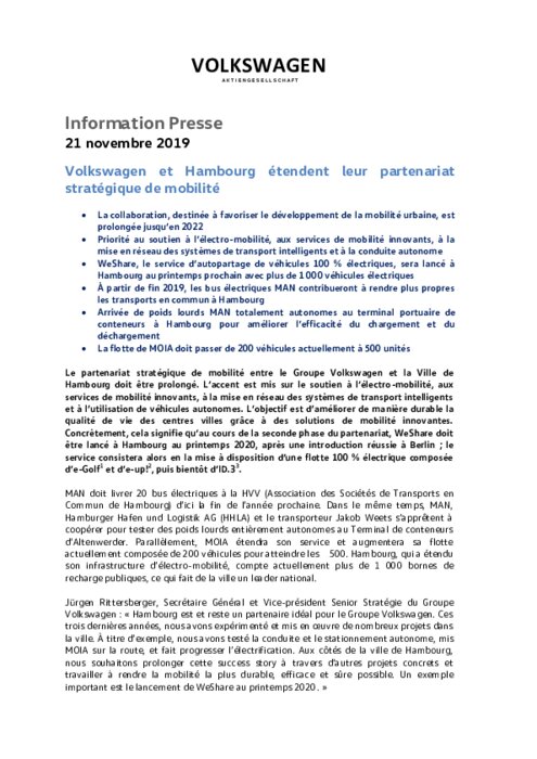 Le partenariat stratégique de mobilité entre le Groupe Volkswagen et la Ville de Hambourg doit être prolongé. L’accent est mis sur le soutien à l’électro-mobilité, aux services de mobilité innovants, à la mise en réseau des systèmes de transport intelligents et à l’utilisation de véhicules autonomes. L’objectif est d’améliorer de manière durable la qualité de vie des centres villes grâce à des solutions de mobilité innovantes...