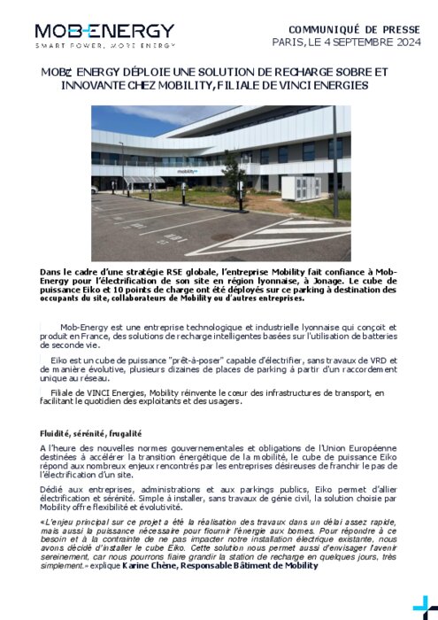 Dans le cadre d’une stratégie RSE globale, l’entreprise Mobility fait confiance à Mob-Energy pour l’électrification de son site en région lyonnaise, à Jonage. Le cube de puissance Eiko et 10 points de charge ont été déployés sur ce parking à destination des occupants du site, collaborateurs de Mobility ou d’autres entreprises.