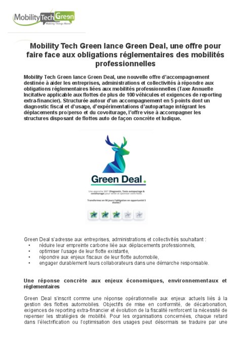 Mobility Tech Green lance Green Deal, une nouvelle offre d’accompagnement destinée à aider les entreprises, administrations et collectivités à répondre aux obligations réglementaires liées aux mobilités professionnelles (Taxe Annuelle Incitative applicable aux flottes de plus de 100 véhicules et exigences de reporting extra-financier). Structurée autour d’un accompagnement en 5 points dont un diagnostic fiscal et d’usage, d’expérimentations d’autopartage intégrant les déplacements pro/perso et du covoiturage, l’offre vise à accompagner les structures disposant de flottes auto de façon concrète et ludique.