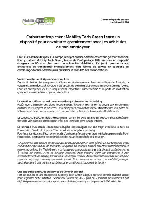 Face à la flambée des prix à la pompe, le trajet domicile-travail devient un gouffre financier. Pour y pallier, Mobility Tech Green, leader de l'autopartage B2B, annonce un dispositif d'urgence de 90 jours. Son nom : le « Bouclier Mobilité ». L'objectif : permettre aux entreprises de transformer immédiatement leurs flottes de service en solutions de covoiturage domicile-travail pour préserver la mobilité des collaborateurs.