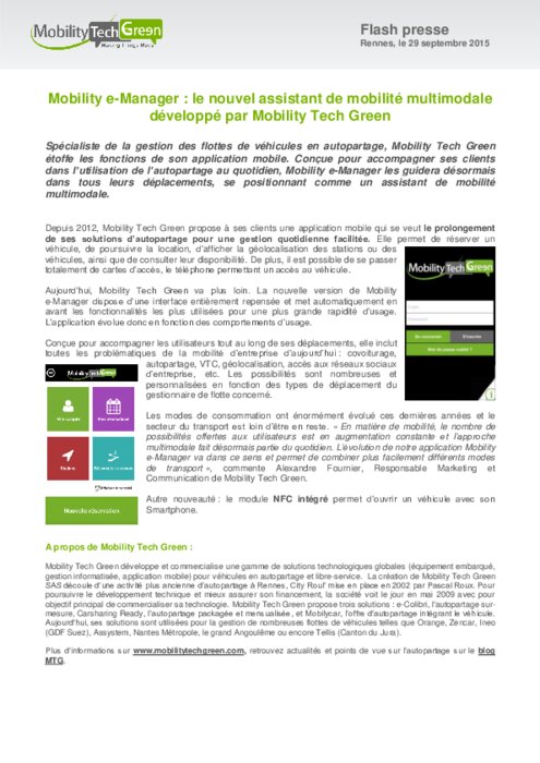 Spécialiste de la gestion des flottes de véhicules en autopartage, Mobility Tech Green étoffe les fonctions de son application mobile. Conçue pour accompagner ses clients dans l’utilisation de l’autopartage au quotidien, Mobility e-Manager les guidera désormais dans tous leurs déplacements, se positionnant comme un assistant de mobilité multimodale.