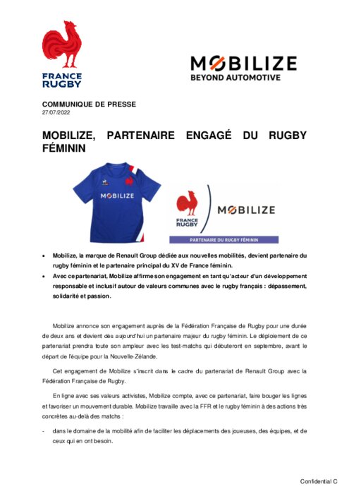 Mobilize, la marque de Renault Group dédiée aux nouvelles mobilités, devient partenaire du rugby féminin et le partenaire principal du XV de France féminin. Avec ce partenariat, Mobilize affirme son engagement en tant qu’acteur d’un développement responsable et inclusif autour de valeurs communes avec le rugby français : dépassement, solidarité et passion.