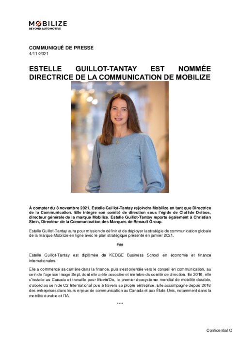 À compter du 8 novembre 2021, Estelle Guillot-Tantay rejoindra Mobilize en tant que Directrice de la Communication. Elle intègre son comité de direction sous l’égide de Clotilde Delbos, directeur générale de la marque Mobilize. Estelle Guillot-Tantay reporte également à Christian Stein, Directeur de la Communication des Marques de Renault Group.