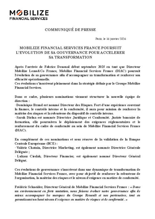 Après l’arrivée de Fabrice Denoual début septembre 2025 en tant que Directeur Mobilize Lease&Co France, Mobilize Financial Services France (DIAC) poursuit l'évolution de sa gouvernance afin d'accompagner sa transformation et renforcer son efficacité opérationnelle.