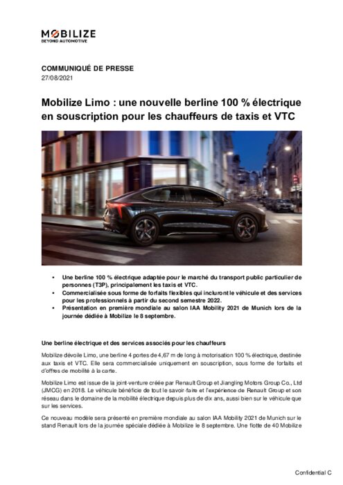 Mobilize dévoile Limo, une berline 4 portes de 4,67 m de long à motorisation 100 % électrique, destinée aux taxis et VTC. Elle sera commercialisée uniquement en souscription, sous forme de forfaits et d’offres de mobilité à la carte. Mobilize Limo est issue de la joint-venture créée par Renault Group et Jiangling Motors Group Co., Ltd (JMCG) en 2018...