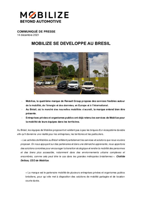 Constructeurs, Services 14 décembre 2021 - 10:05 Au Brésil, les équipes de Mobilize proposent et valident pas à pas les briques d'un écosystème durable afin qu’il devienne une réalité pour les entreprises, les territoires et les particuliers. PDF (657 Ko) Télécharger