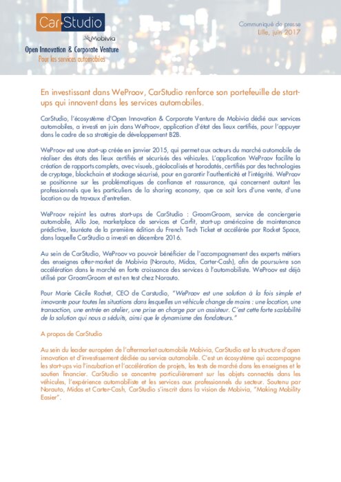 CarStudio, l'écosystème d'Open Innovation & Corporate Venture de Mobivia dédié aux services automobiles, a investi en juin dans WeProov, application d'état des lieux certifiés, pour l'appuyer dans le cadre de sa stratégie de développement B2B.