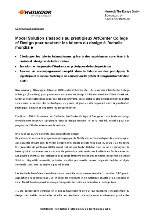 Model Solution Co., Ltd. s’associe à l'ArtCenter College of Design (États-Unis) pour promouvoir les talents du design à l’échelle mondiale. Filiale d’Hankook, Model Solution est reconnue pour ses designs innovants, ses prototypes et le développement de petites séries dans le secteur des technologies de pointe, et joue un rôle important dans la planification stratégique à moyen et long terme du groupe Hankook.