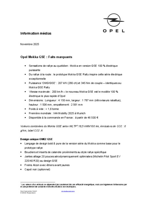 La haute performance en production de série, c’est l’ADN des nouveaux modèles GSE 100% électriques d’Opel, et tout commence avec le Mokka GSE,. « Avec le Mokka GSE, nous apportons la sensation du rallye sur la route », promettent les responsables d’Opel. Et ils tiennent leur promesse : cette nouvelle voiture sportive de série GSE de 207 kW (281 ch), inspirée du prototype de compétition Opel Mokka GSE Rally, est disponible à la commande depuis quelques semaines.