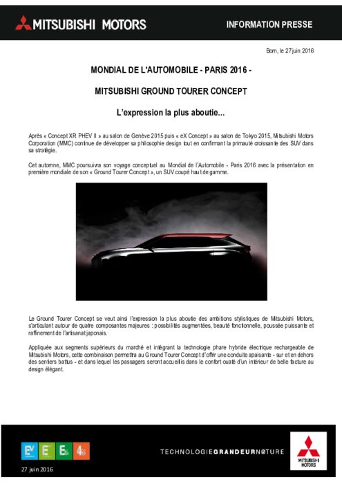Après " Concept XR PHEV II " au salon de Genève 2015 puis " eX Concept " au salon de Tokyo 2015, Mitsubishi Motors Corporation (MMC) continue de développer sa philosophie design tout en confirmant la primauté croissante des SUV dans sa stratégie. Cet automne, MMC poursuivra son voyage conceptuel au Mondial de l’Automobile - Paris 2016 avec la présentation en première mondiale de son " Ground Tourer Concept ", un SUV coupé haut de gamme.
