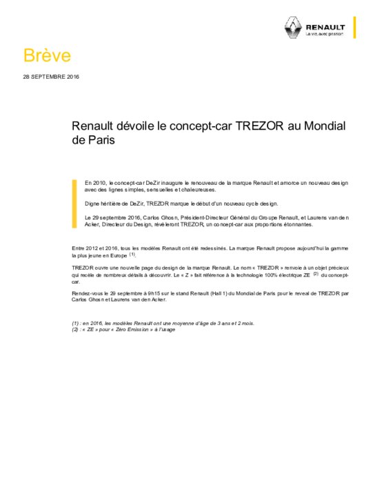 En 2010, le concept-car DeZir inaugure le renouveau de la marque Renault et amorce un nouveau design avec des lignes simples, sensuelles et chaleureuses. Digne héritière de DeZir, TREZOR marque le début d’un nouveau cycle design. Le 29 septembre 2016, Carlos Ghosn, Président-Directeur Général du Groupe Renault, et Laurens van den Acker, Directeur du Design, révèleront TREZOR, un concept-car aux proportions étonnantes.