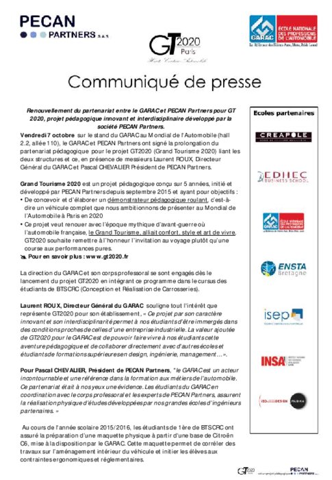 Vendredi 7 octobre sur le stand du GARAC au Mondial de l'Automobile (hall 2.2, allée 110), le GARAC et PECAN Partners ont signé la prolongation du partenariat pédagogique pour le projet GT2020 (Grand Tourisme 2020) liant les deux structures et ce, en présence de messieurs Laurent ROUX, Directeur Général du GARAC et Pascal CHEVALIER Président de PECAN Partners.