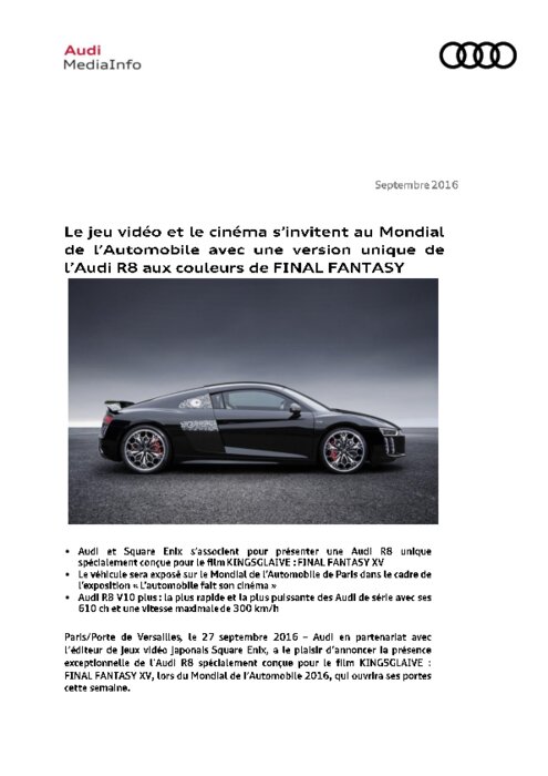 Audi en partenariat avec l’éditeur de jeux vidéo japonais Square Enix, a le plaisir d’annoncer la présence exceptionnelle de l’Audi R8 spécialement conçue pour le film KINGSGLAIVE : FINAL FANTASY XV, lors du Mondial de l’Automobile 2016, qui ouvrira ses portes cette semaine.