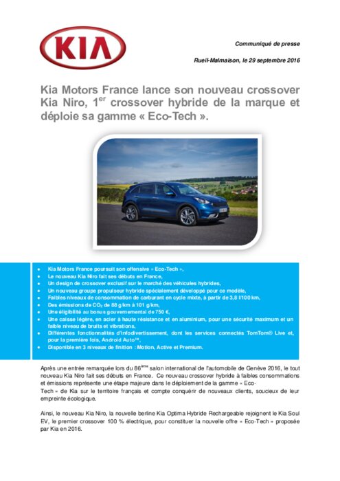 Après une entrée remarquée lors du 86ème salon international de l'automobile de Genève 2016, le tout nouveau Kia Niro fait ses débuts en France. Ce nouveau crossover hybride à faibles consommations et émissions représente une étape majeure dans le déploiement de la gamme « Eco-Tech » de Kia sur le territoire français et compte conquérir de nouveaux clients, soucieux de leur empreinte écologique.