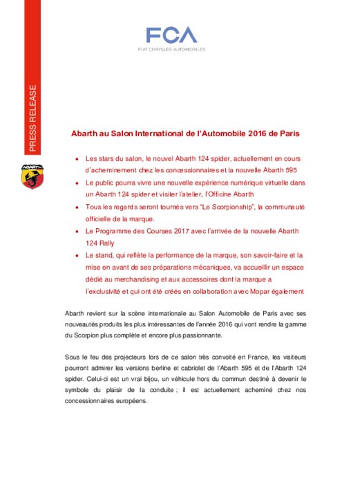 Constructeurs 23 septembre 2016 - 19:36 Abarth revient sur la scène internationale au Salon Automobile de Paris avec ses nouveautés produits les plus intéressantes de l’année 2016 qui vont rendre la gamme du Scorpion plus complète et encore plus passionnante. Voir toutes les infos sur le Mondial de l'Automobile 2016 PDF (1 Mo) Télécharger