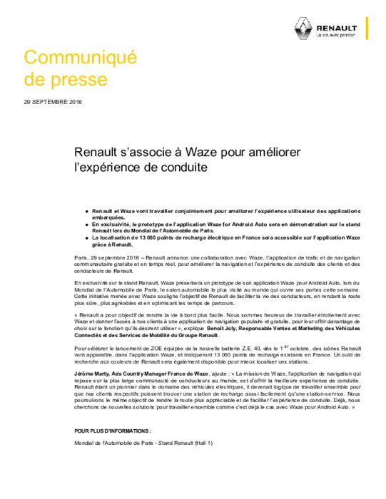 Renault annonce une collaboration avec Waze, l’application de trafic et de navigation communautaire gratuite et en temps réel, pour améliorer la navigation et l’expérience de conduite des clients et des conducteurs de Renault. En exclusivité sur le stand Renault, Waze présentera un prototype de son application Waze pour Android Auto, lors du Mondial de l’Automobile de Paris, le salon automobile le plus visité au monde qui ouvre ses portes cette semaine.