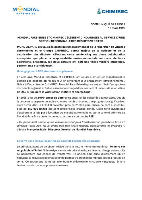 MONDIAL PARE-BRISE, spécialiste du remplacement et de la réparation de vitrages automobiles et le Groupe CHIMIREC, acteur majeur de la collecte et de la valorisation des déchets, célèbrent cette année cinq ans d’une collaboration exemplaire qui place la responsabilité environnementale au cœur de leurs opérations. Ensemble, les deux acteurs ont bâti une filière verrière structurée, performante et ambitieuse.