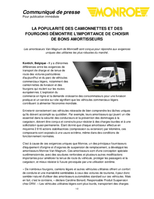 Les amortisseurs Van-Magnum de Monroe sont conçus pour répondre aux exigences uniques des utilitaires les plus robustes du marché. Il y a d'énormes différences entre les exigences de transport de charge et de tenue de route des voitures particulières d'aujourd'hui et du parc de véhicules commerciaux légers, notamment des camionnettes de livraison et des fourgons qui roulent sur les routes européennes...