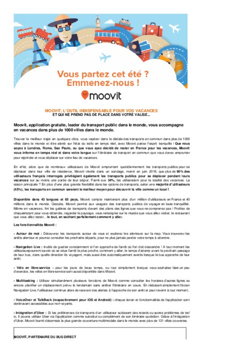Trouver le meilleur trajet en quelques clics, vous repérer dans le dédale des transports en commun dans plus de 1000 villes dans le monde et être alerté sur l'état du trafic en temps réel, avec Moovit partez l'esprit tranquille ! Que vous soyez à Londres, Rome, Sao Paulo, ou que vous ayez décidé de rester en France pour les vacances, Moovit vous informe en temps réel et dans votre langue sur l'itinéraire de transport en commun que vous devez emprunter pour rejoindre et vous déplacer en vacances.