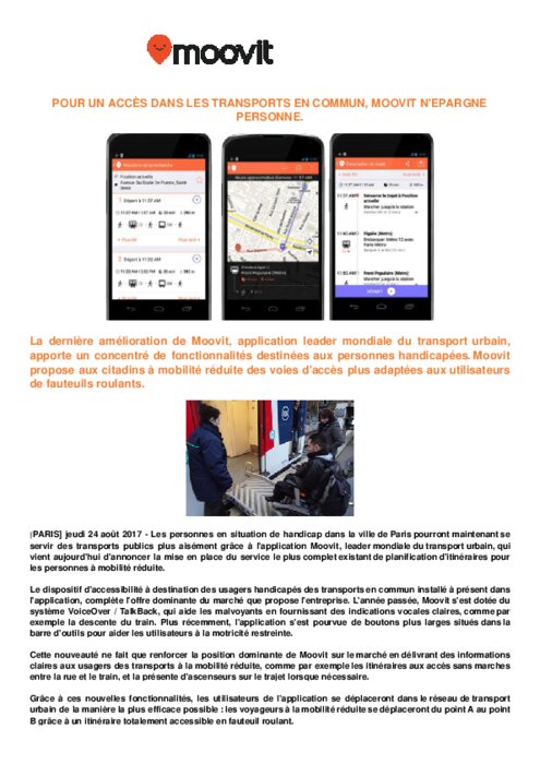 Les personnes en situation de handicap dans la ville de Paris pourront maintenant se servir des transports publics plus aisément grâce à l'application Moovit, leader mondiale du transport urbain, qui vient d'annoncer la mise en place du service le plus complet existant de planification d'itinéraires pour les personnes à mobilité réduite.