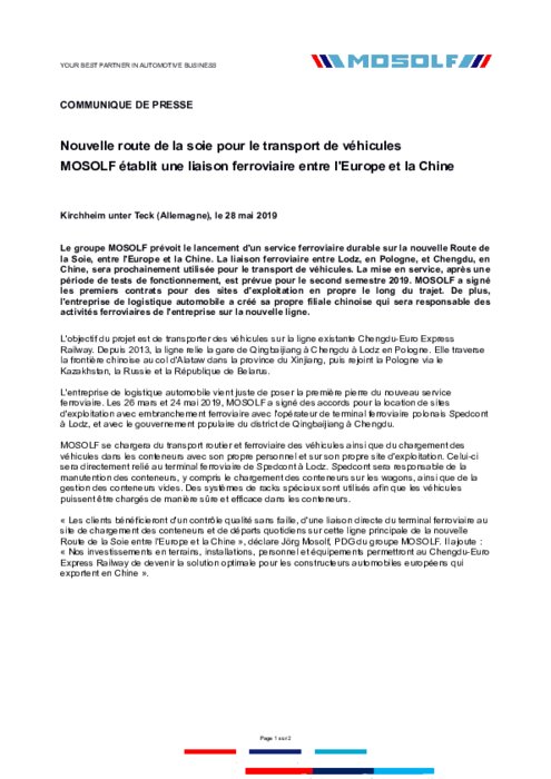 Le groupe MOSOLF prévoit le lancement d'un service ferroviaire durable sur la nouvelle Route de la Soie, entre l'Europe et la Chine. La liaison ferroviaire entre Lodz, en Pologne, et Chengdu, en Chine, sera prochainement utilisée pour le transport de véhicules. La mise en service, après une période de tests de fonctionnement, est prévue pour le second semestre 2019. MOSOLF a signé les premiers contrats pour des sites d'exploitation en propre le long du trajet. De plus, l'entreprise de logistique