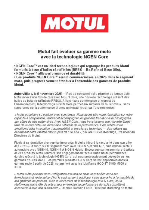 Fort de son savoir-faire pionnier de longue date, Motul innove une fois de plus avec NGEN Core, une nouvelle technologie utilisant des huiles de base re-raffinées (RRBO). Alliant haute performance et respect de l’environnement, la technologie NGEN Core permet aux motards de rouler mieux, sans compromis sur la performance et avec un impact réduit sur l’environnement.