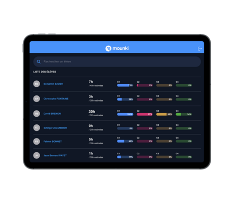 - Côté enseignant : l’application Mounki Assistant (Fiche de suivi dématérialisée) permet de simplifier et optimiser sa pédagogie grâce à un suivi digitalisé. Un bilan est généré automatiquement par l’application après chaque session. Il est transmis directement à l’élève.