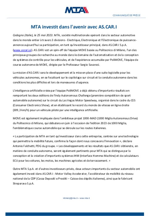 Codogno (Italie), le 25 mai 2023. MTA, société multinationale opérant dans le secteur automotive dans le monde entier à travers 3 divisions - Electrique, Electronique et l’Electronique de puissance - annonce aujourd'hui sa participation, en tant qu'investisseur principal, dans AS.CAR.I S.p.A. (www.ascari.ai). AS.CAR.I est un spin-off de l'équipe MOVE basée au Politecnico di Milano, l'un des principaux groupes de recherche au monde dans le domaine de l'automatisation.