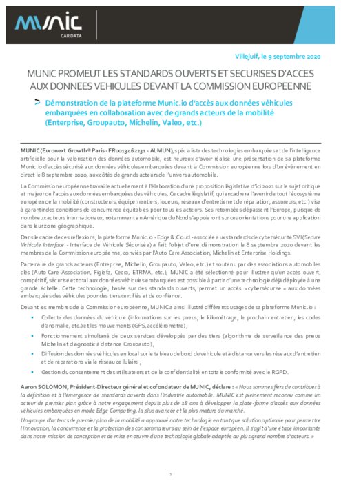 MUNIC, spécialiste des technologies embarquées et de l’intelligence artificielle pour la valorisation des données automobiles, est heureux d’avoir réalisé une présentation de sa plateforme Munic.io d’accès sécurisé aux données véhicules embarquées devant la Commission européenne lors d'un événement en direct le 8 septembre 2020, aux côtés de grands acteurs de l’univers automobile...