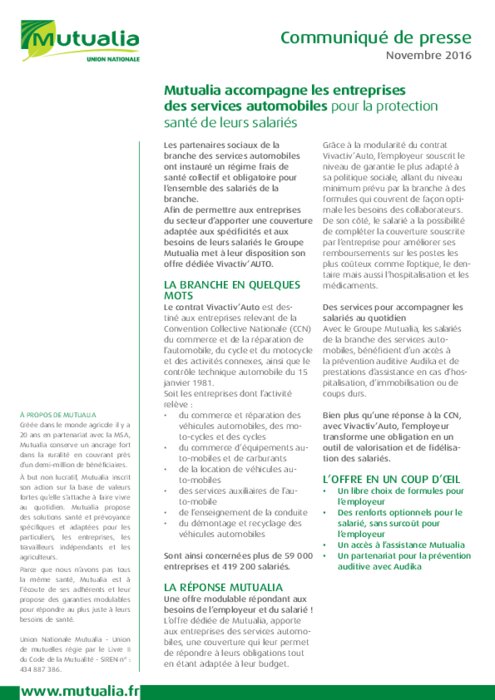 Les partenaires sociaux de la branche des services automobiles ont instauré un régime frais de santé collectif et obligatoire pour l’ensemble des salariés de la branche. Afin de permettre aux entreprises du secteur d’apporter une couverture adaptée aux spécificités et aux besoins de leurs salariés le Groupe Mutualia met à leur disposition son offre dédiée Vivactiv’AUTO.