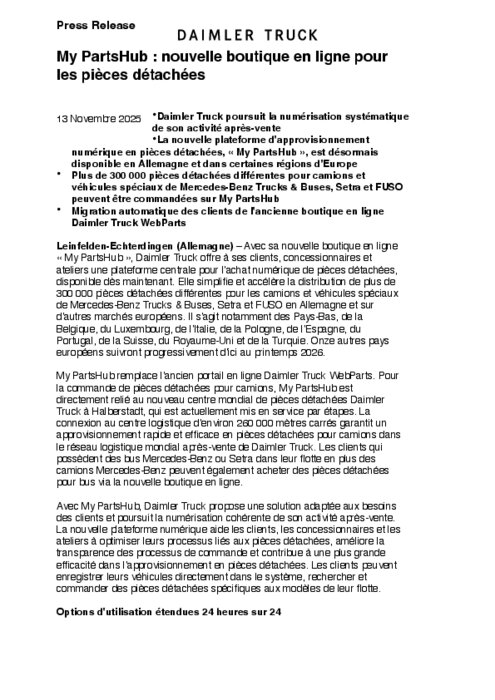 Avec sa nouvelle boutique en ligne « My PartsHub », Daimler Truck offre à ses clients, concessionnaires et ateliers une plateforme centrale pour l'achat numérique de pièces détachées, disponible dès maintenant. Elle simplifie et accélère la distribution de plus de 300 000 pièces détachées différentes pour les camions et véhicules spéciaux de Mercedes-Benz Trucks & Buses, Setra et FUSO en Allemagne et sur d'autres marchés européens. Il s'agit notamment des Pays-Bas, de la Belgique, du Luxembourg, de l'Italie, de la Pologne, de l'Espagne, du Portugal, de la Suisse, du Royaume-Uni et de la Turquie.